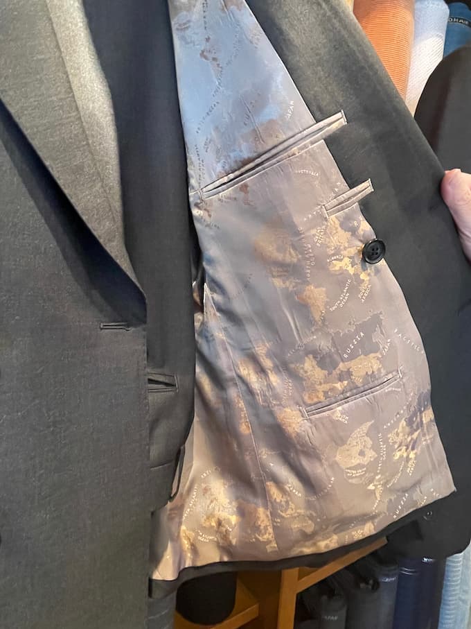 裏地には金の光沢で世界地図が描かれた遊び心のある生地を取り入れました。ナチュラルなグレーの裏にチラッと見える世界地図の生地は抜群のアクセントになります。