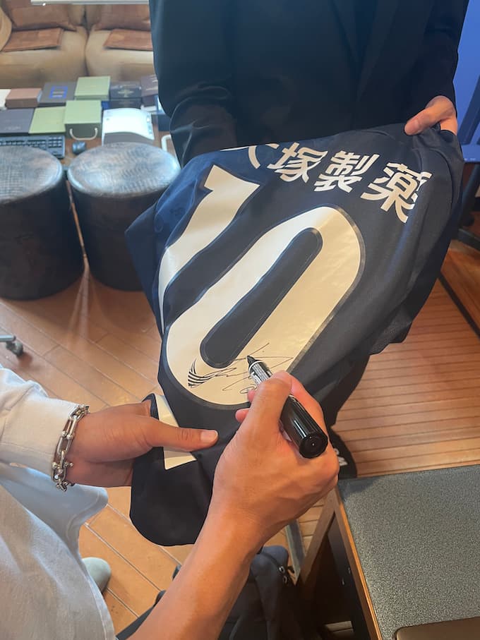 納品前の試着やチェックが終わった後は、徳島ヴォルティスの熱烈なファンのために、サインにも快く対応いただきました!ユニフォームに色紙に、、、ファンの方にとっては最高の宝物ですね!