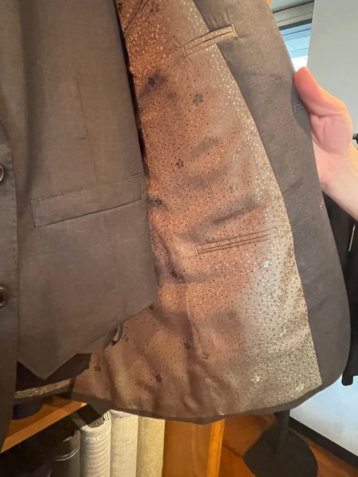 裏地には全体の生地と同じブラウンカラーに、さりげなく花柄があしらわれた生地をチョイスしました。ドットのような柄の中に同じブラウンで馴染むように散りばめられた花柄がかっこよさとちょっとした可愛さを表現していて、こちらも杉森選手にピッタリです。