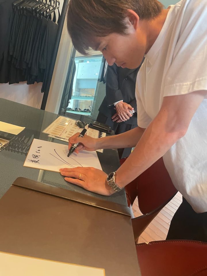 こだわりの1着をお渡しした後、サインをお願いしましたが快く書いていただきました!キリッとした表情で真剣にサインを書く杉森選手・・・生き残りの激しい戦いの中で日々戦うプロの選手はオーラがあって圧倒されます。