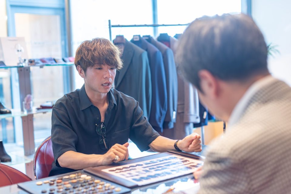 生地のほかにも、ボタンなどのオプションもスーツに合わせてお選びいただきました!種類が多すぎて逆に選ぶのが大変と思ってしまうかもですが、お客様のご要望や選ぶ時の表情などをトータルで分析し、的確なご提案ができるのもfromGが支持されているポイントです。