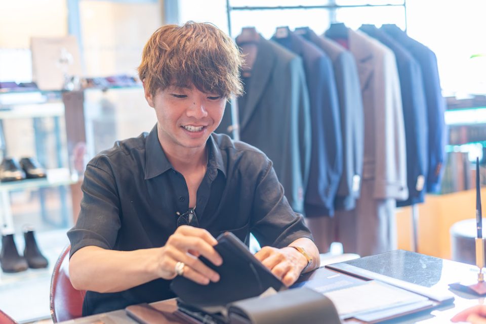 生地やオプションをお選びいただいた後は、試着室にてサイズのフィッティングです。からの形や大きさは十人十色。袖周りや裾の長さなどありとあらゆる箇所を採寸し、児玉選手だけのオリジナルオーダースーツを仕立てていきます。完成を想像し、よりワクワク感が高まっていきます!